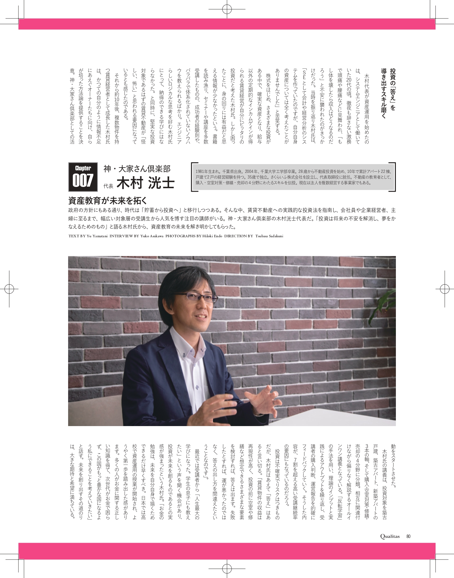 2022年9月15日、雑誌『Qualitas』に掲載されました。著名な経営者方の中、ありがたい事に、神・大家さん俱楽部と代表として取り上げられました。今後の日本に不動産投資を広めていく為の考えやスクールでの営みについて、インタビューを受けています。